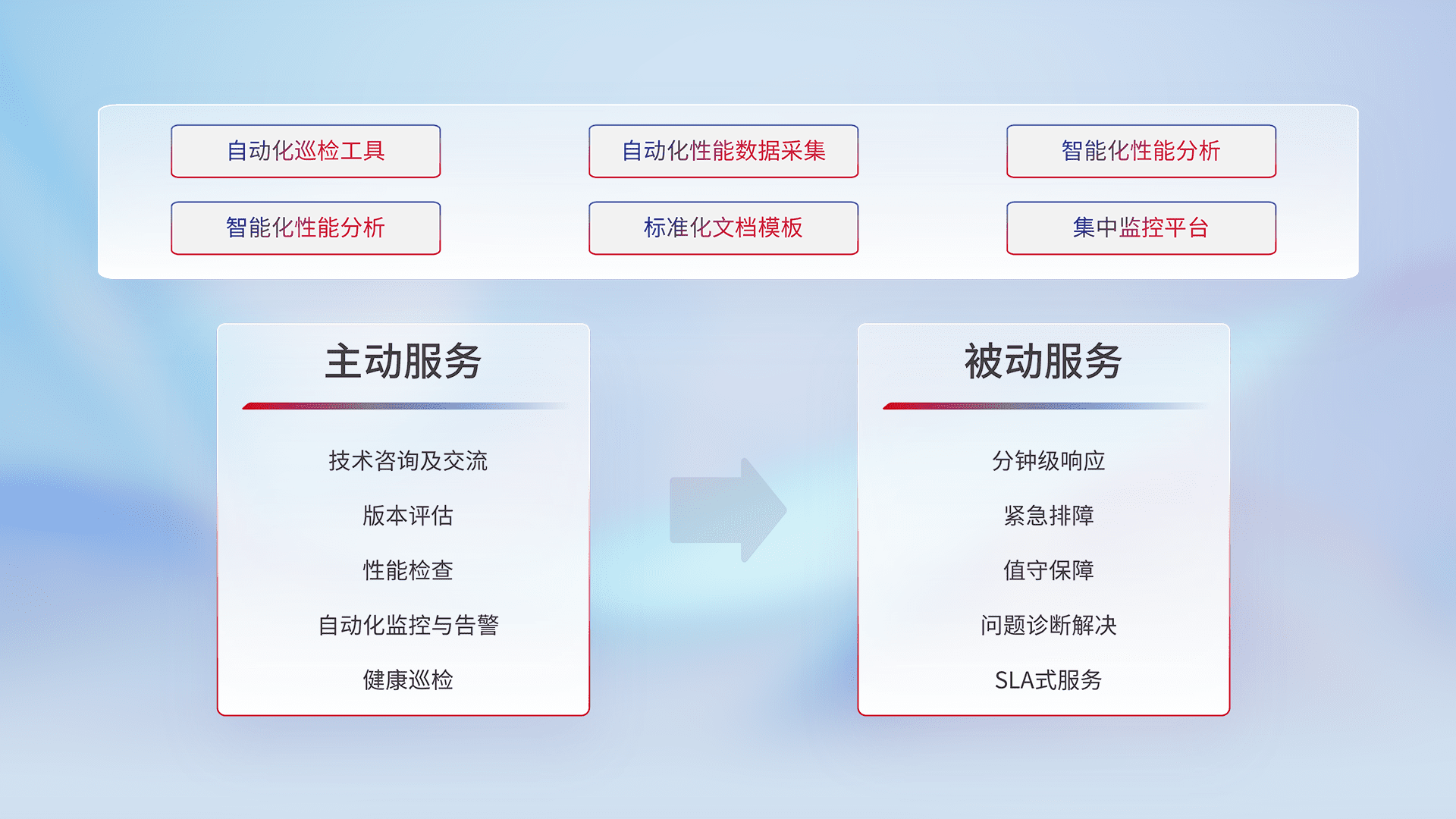 智能化工具和标准化文档,,保障服务质量,,,提供主动服务(包含技术咨询、、、、版本评估、、性能检查、、自动化监控与告警、、、、健康巡检)和被动服务包含(分钟级响应、、紧急排障、、、值守保障、、、问题诊断解决、、、、SLA服务)。。