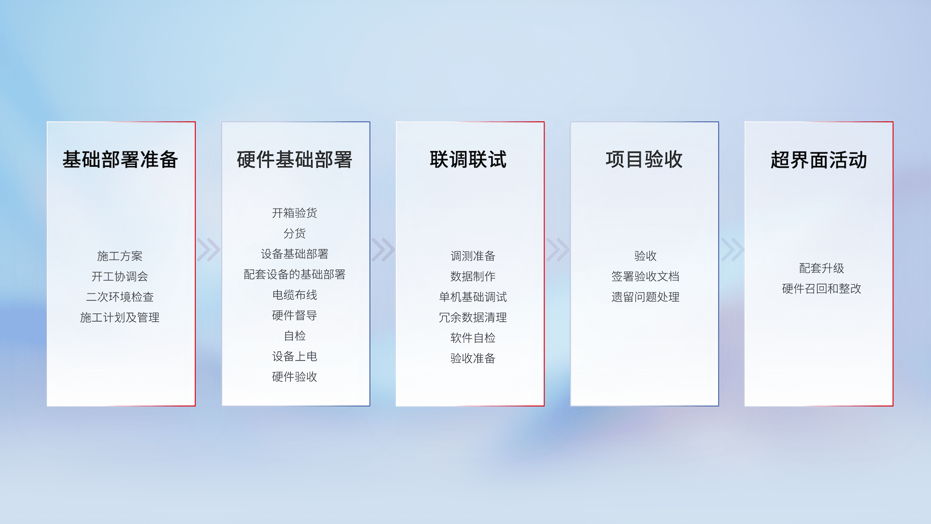 从基础部署准备、、、、硬件基础部署、、、、联调联试、、、、项目验收、、越界面活动的全过程可追溯,,保证施工质量和进度。。。。